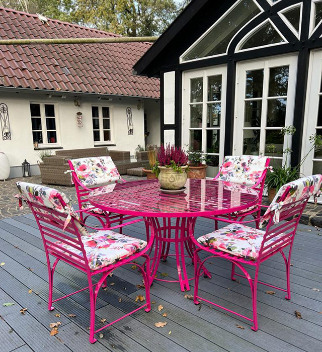 Alle haben es aber in den letzten Monaten wieder gesehen: Gerade wenn die graue Herbst- und Wintersaison Einzug hält, kann eine so lebendige Farbe wie Telemagenta Pink wirklich dazu beitragen, Terasse und Garten Farbe und Leben zu verleihen und die Stimmung aufzuhellen. Es ist wie ein kleiner Sonnenschein, der auch an trüben Tagen strahlt. Es war also jeden Fall die richtige Entscheidung – meint die Familie inzwischen.