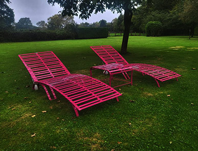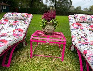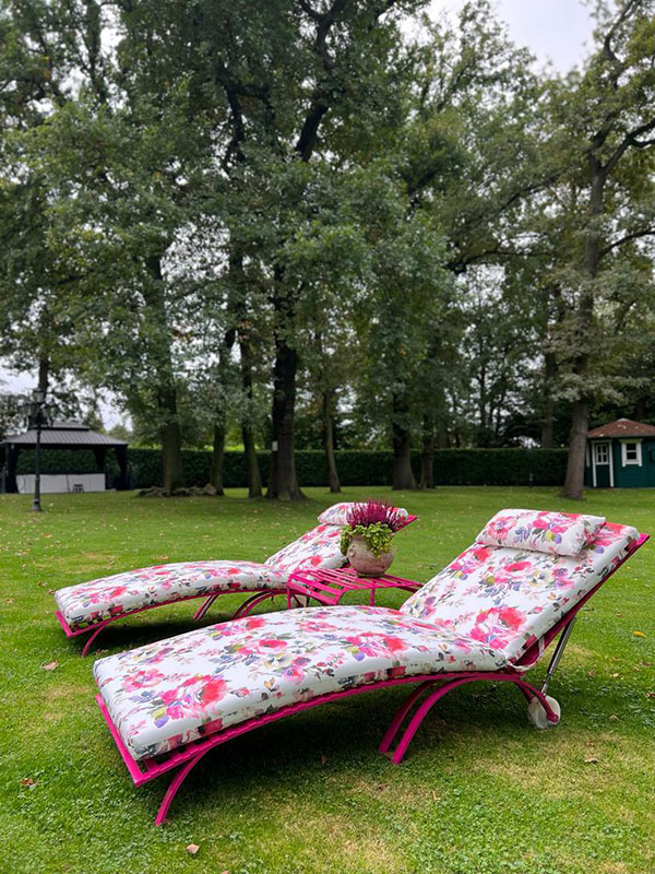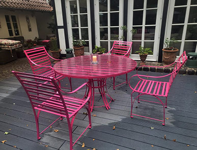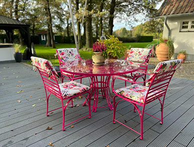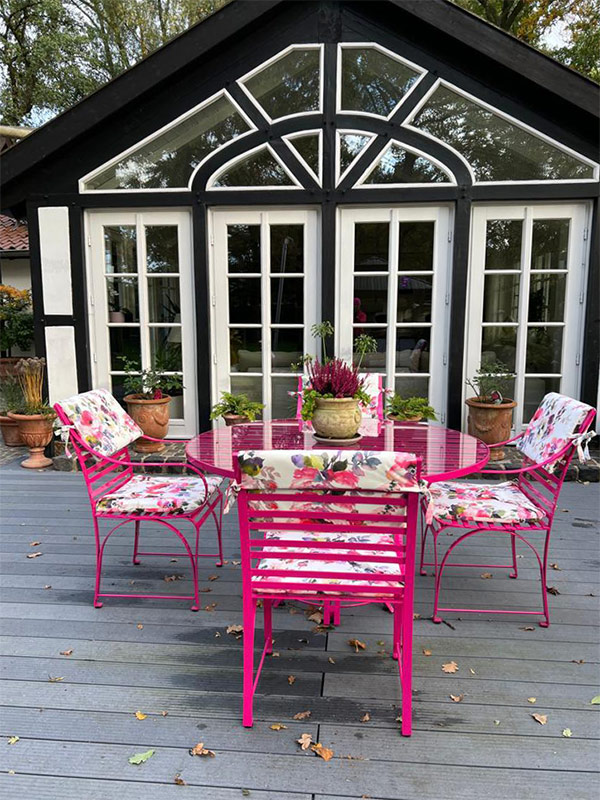 Die Gartenmöbel strahlen leuchtende Frische aus, geben dem Anwesen mit Garten Leben, machen es bunt wie Blumen und passen zur Eleganz des Fachwerkhauses.