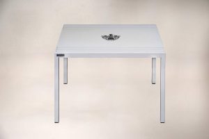 Ganz neu im Programm ist der kleine Grand Plaza Bistrotisch mit Wappen auf der inneren Tischoberfläche. Passend für kleine süße Ecken oder beigestellt beim Tee bzw. Kaffee trinken.Ergänzt werden kann der Bistrotisch durch einen Esstisch oder Beistelltisch mit Glasplatte, Bar-Desk mit Granitplatte, Barbank sowie Barhocker. Weiterhin können Gartentische die Designlinie Grand Plaza komplettieren